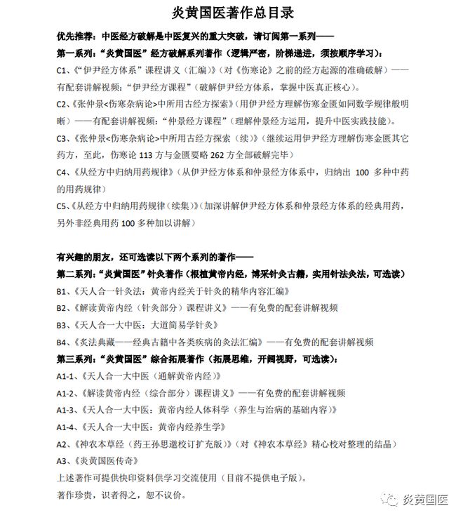 C1、《“伊尹经方体系”课程讲义(汇编)》(对《伤寒论》之前的经方起源的准确破解)——有配套讲解视频:“伊尹经方课程”(破解伊尹经方体系,掌握中医线、《张仲景伤寒杂病论中所用古经方探索》(用伊尹经方理解伤寒金匮如同数学规律般明晰)——有配套讲解视频:“仲景经方课程”(理解仲景经方运用,提升中医实践技能)。
