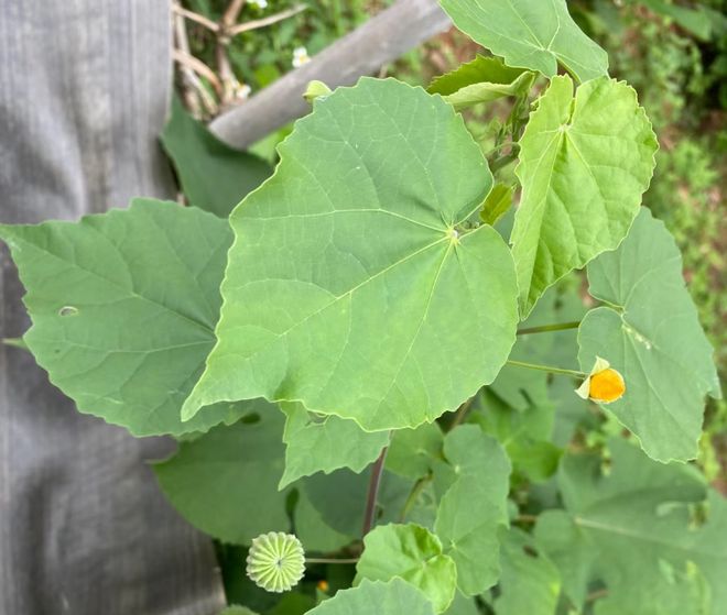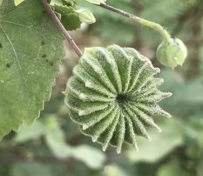 磨盘草,因其果实很像磨盘而得名。磨盘草也叫耳响草、响耳草,因为磨盘草的果实成熟之后,用手摇晃可以听到种子与壳碰撞的响声,故名。磨盘草也叫木磨子、白麻、苘麻、磨仔草,它是锦葵科、苘麻属一年或多年生亚灌木草本植物,和苘麻是“亲兄弟”,近缘关系。